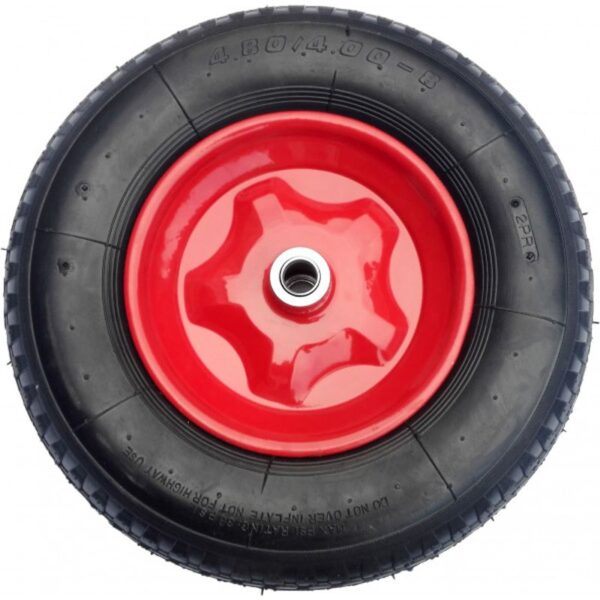 Пневматическое колесо с камерой диаметром 380 мм., применяемое к тачке для эксплуатации внутри и снаружи помещений. Цвет черный.